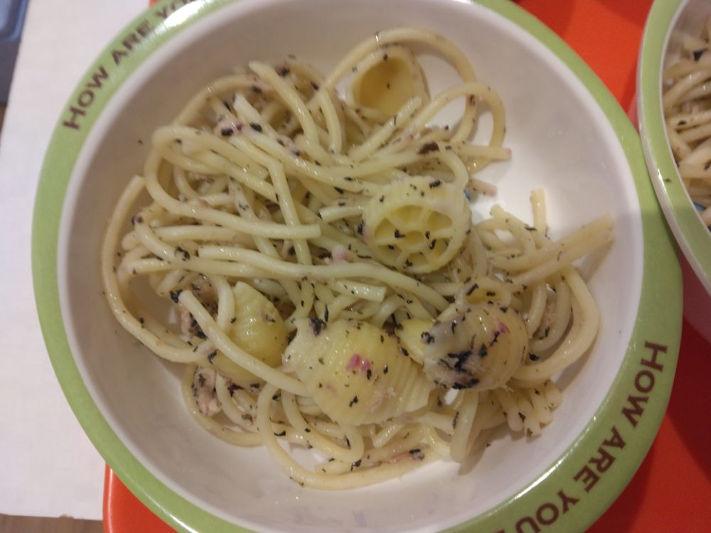 本日の15時おやつはツナゆかりスパゲッティでした❣️お子様達が楽しく食べれるようにマカロニも混ぜて遊び心を入れました☺