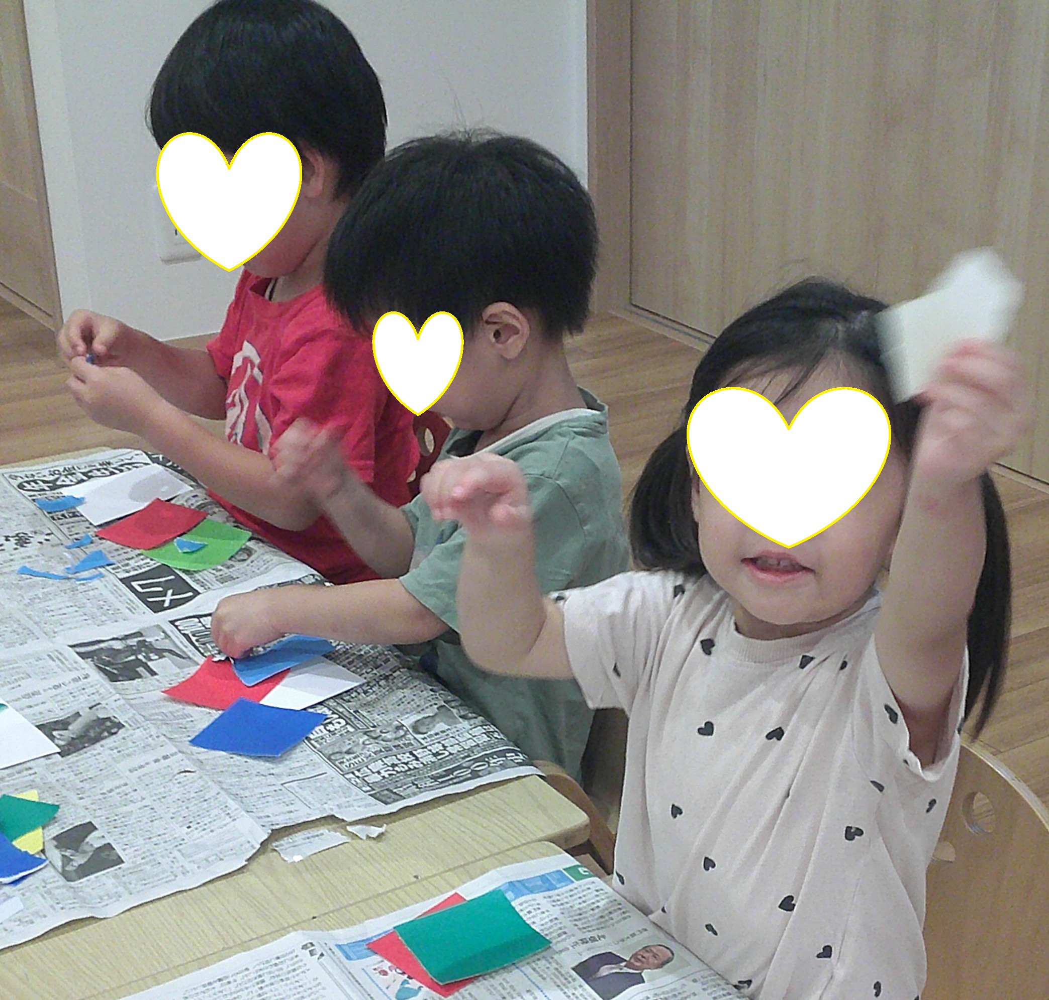 2歳児クラスカーネーション組さん、自身でちぎった折り紙でモンスターを作ります✨