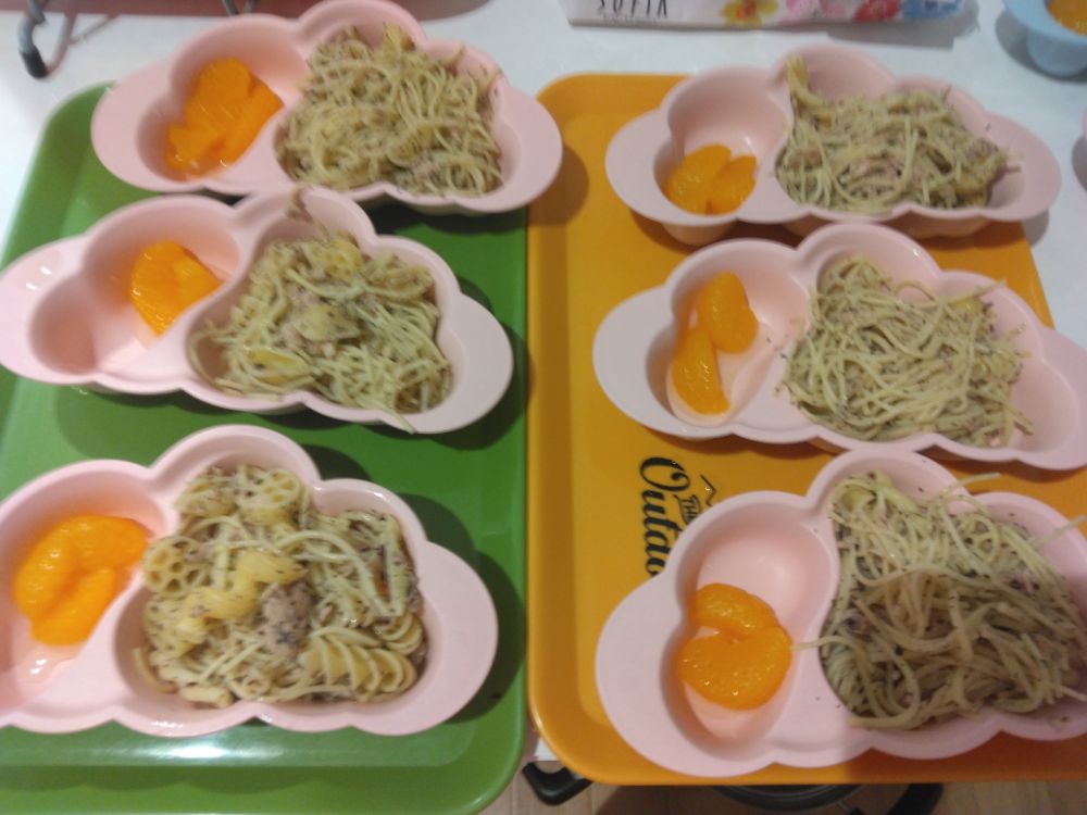 つくば市ルンルン保育園春日です。10/27ルンルン保育園春日の15時おやつは手作りつなゆかりペンネでした🍝