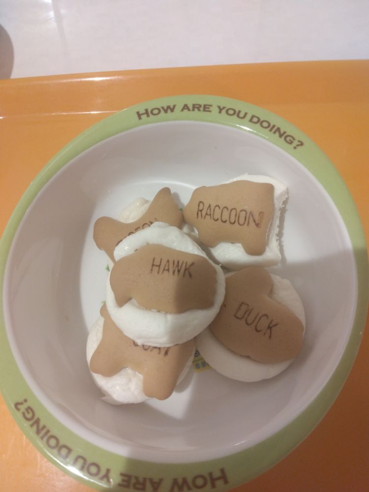 オーブンで加熱したマシュマロに厚焼きたべっこ動物を組み合わせて作りました🐹ふんわりサクサク✨✨食べ応えがあってルンルン保育園春日のお子様達が大好きなおやつです😃
