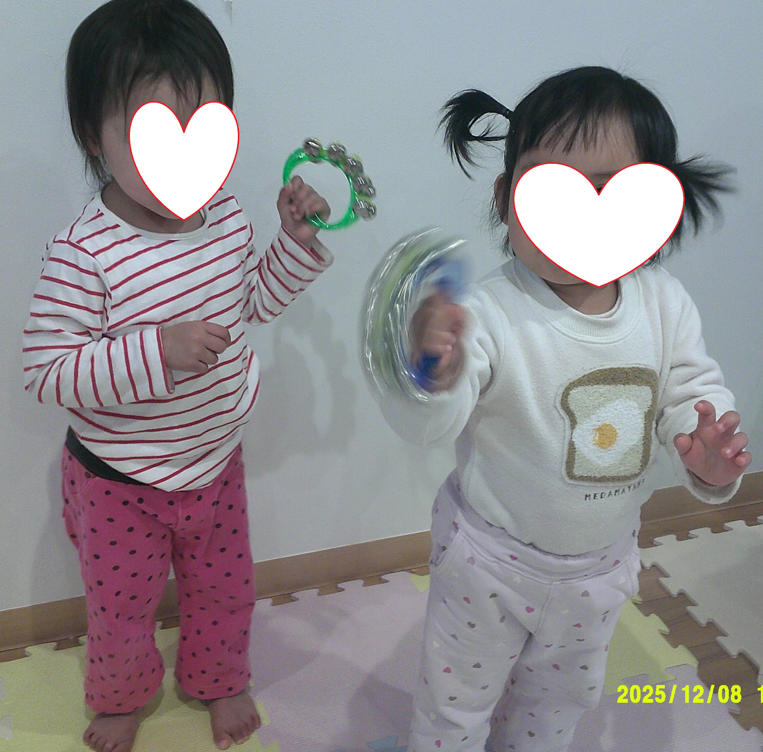 出来上がった製作を持って0歳児クラスさんも表情豊かにイェーイ😊