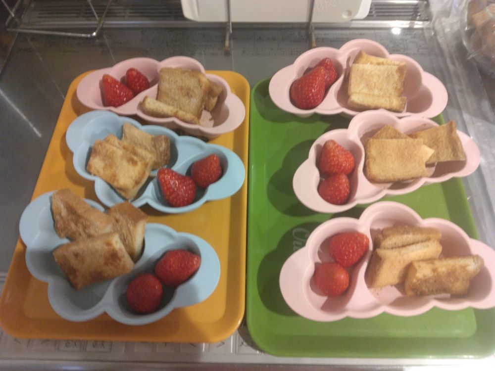 皆大好き💝サクサク手作り食パンきな粉ラスク&卒園児さんから頂いた豪華な🍓いちごでした😍🍓みんないちご大好き❣️