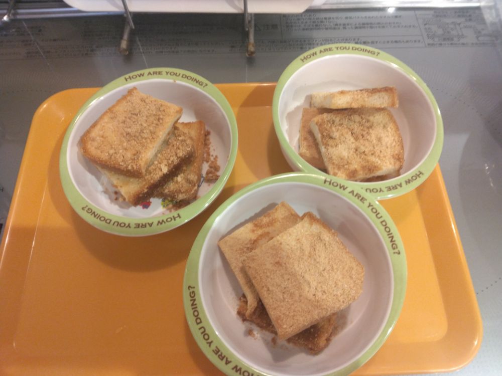 ルンルン保育園春日の15時おやつには色々なおやつが登場します❣️おやつ作りで心がけている事はたんぱく質摂取です☺ツナやきな粉、豆乳、お豆腐、おから等おやつに取り入れています✌😊✌